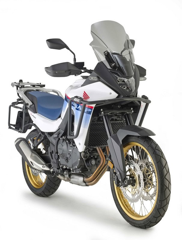 Sulla Honda Transalp sono state montate due borse posteriori: il modello cargo GRT723 da 40 litri, dotato di attacco Monokey, e la borsa a rullo GRT724 da 12 litri, entrambe agganciate tramite un sistema di cinghie integrate. Per il fissaggio alla moto, Givi ha utilizzato la piastra in alluminio anodizzato M8A e l’attacco specifico SR1201. Le borse laterali GRT720 da 25 litri ciascuna sono abbinate al portavaligie specifico PL One-Fit per modelli Monokey PL01201MK.
