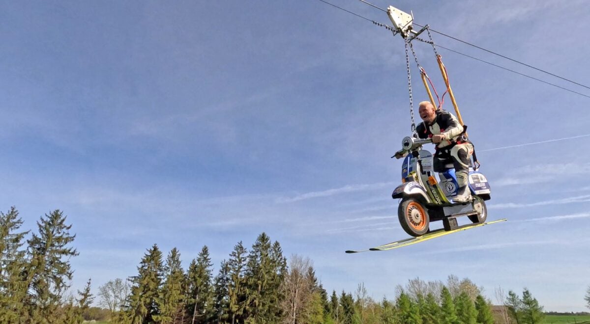 Schachermayr, noto per le sue audaci imprese con una Vespa, ha effettuato un salto da un trampolino per il salto con gli sci. L’evento si è svolto a Höhenhart, una località sciistica nel distretto di Braunau am Inn, in Alta Austria, dove è presente un trampolino che, con condizioni atmosferiche ideali, permette ai saltatori di planare fino a 45 metri d’altezza e coprire distanze di 200 metri. A differenza dei saltatori tradizionali che usano la neve, Schachermayr ha effettuato il suo volo su un campo erboso.