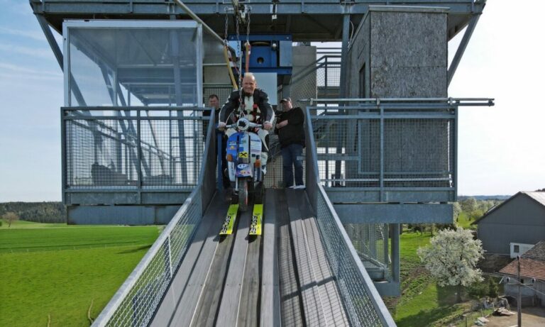Lo stuntman Günter Schachermayr conquista un nuovo record con un incredibile salto in Vespa da un trampolino sciistico, atterrando dopo 198,5 metri.