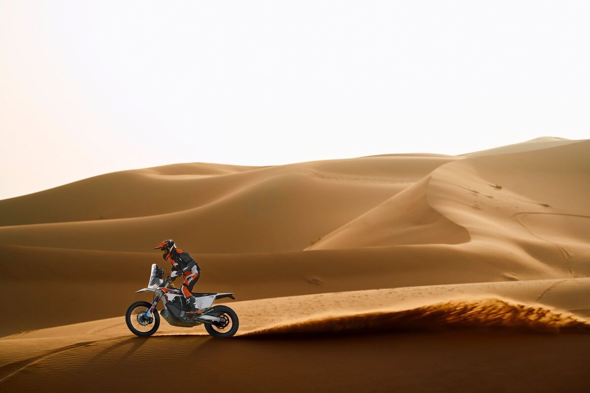 Per quanto riguarda le sospensioni, monta il sistema WP Pro Components, che include una forcella WP XACT PRO e un ammortizzatore WP XACT PRO, entrambi personalizzabili. Esteticamente, la nuova KTM 450 RALLY REPLICA sfoggia un design più aggressivo e tagliente, con una torretta di navigazione in fibra di carbonio e un nuovo cupolino che riduce turbolenza e vento. La carena integra un quadro strumenti più compatto e un nuovo sistema di illuminazione LED più potente del 33%, essenziale per le tappe all’alba o in notturna.