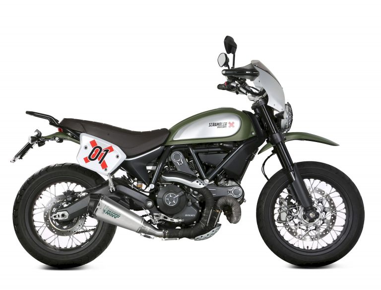 MIVV ha già in catalogo una serie di terminali di scarico già disponibili per la Scrambler Ducati 800 (GP, Suono, X-Cone, Ghibli), ma oggi offre la possibilità di creare un gemellaggio dal look invidiabile, adottando, sulle versioni dal 2015 a oggi, l’elegante e tecnologico Delta Race, in versione Inox e Inox Nero o il più sportivo GP Pro in Titanio, Carbonio oppure in Inox Nero. Le differenti finiture si adattano al meglio alla livrea e allo stile che si desidera conferire a questa Ducati. Delta Race e GP Pro si montano in posizione standard e sono perfettamente in regola con le vigenti norme Euro 4 riguardanti le emissioni sonore e rientrano nei limiti imposti per quelle inquinanti, aggiungendo il kit catalizzatore metallico di MIVV (codice ACC.041.A1), il cui costo è di 96 euro.