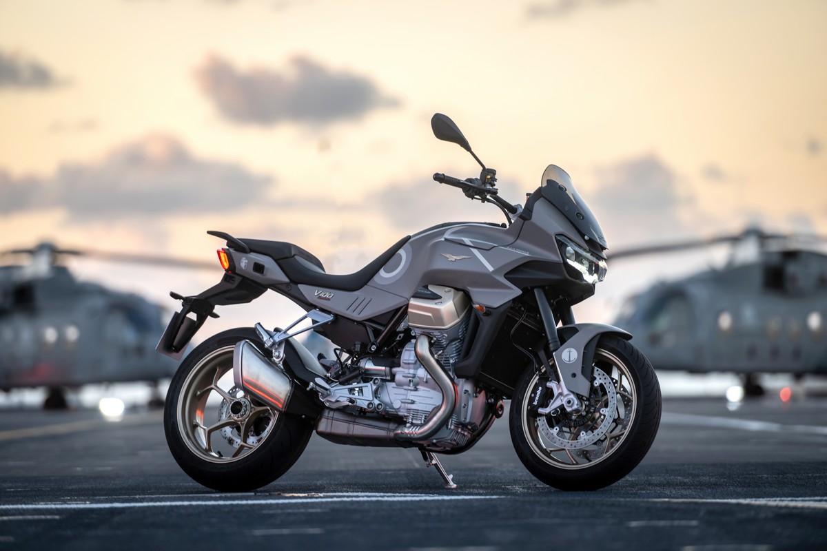 Nello spettacolare scenario del ponte di volo della portaerei Cavour, Moto Guzzi e la Marina Militare hanno celebrato il profondo legame che li unisce da oltre un secolo con il lancio di: Moto Guzzi V100 Mandello Aviazione Navale.