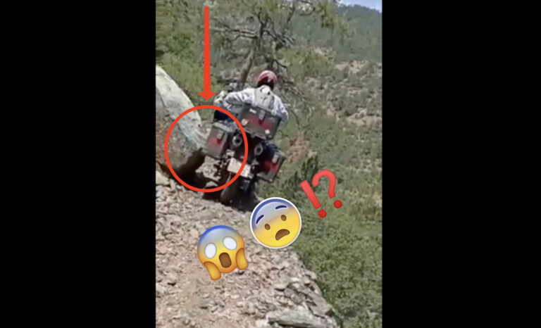 E come prevedibile, arriva il momento in cui i nostri amici in moto incontrano un masso che quasi blocca la strada. Il motociclista con il caso rosso si avvicina molto lentamente e con cautela. Lo vediamo nel video avvicinarsi sempre di più al tratto più stretto.