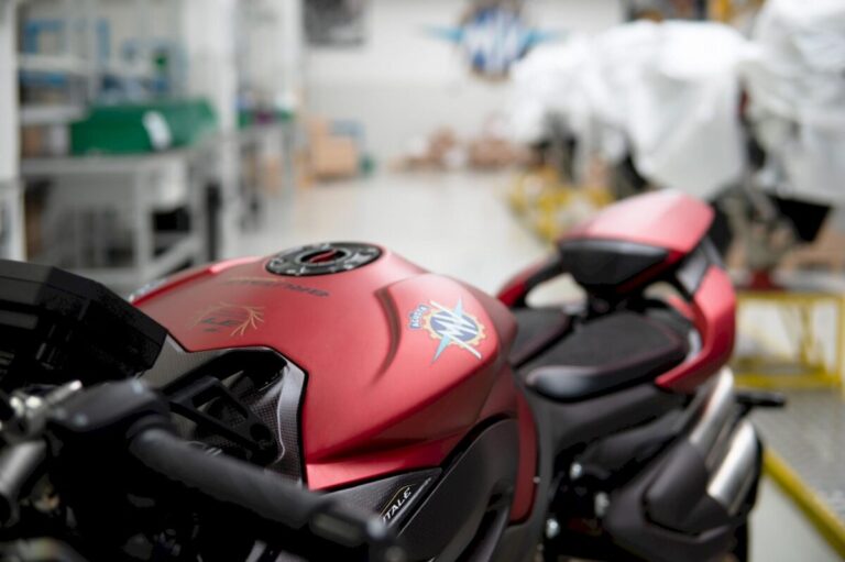 La cura dei dettagli trova conferma in alcuni particolari degni di nota, come la sella del pilota sdoppiata, realizzata tramite lavorazione artigianale e che lascia intravedere la pregiata trama della fibra di carbonio sottostante, il portatarga fissato al monobraccio, i supporti delle pedane ricavati dal pieno come sulla specialissima RVS#1 o, ancora, la sella del passeggero rimovibile per poter essere sostituita con una cover (fornita di serie), anch’essa in fibra di carbonio, e rendere così la moto monoposto. La colorazione rosso fuoco con finitura opaca crea un esclusivo effetto metallico, che per resa visiva si avvicina all’effetto dell’anodizzazione: un ulteriore tocco di ricercatezza. La connotazione esclusiva della nuova Brutale 1000 Serie Oro è sottolineata dalla realizzazione in serie limitata a 300 unità e dalla fornitura di un kit dedicato, composto dallo scarico in titanio e dalla mappatura dedicata, soluzioni destinate a elevare ulteriormente le già eccezionali prestazioni di una naked unica al mondo.