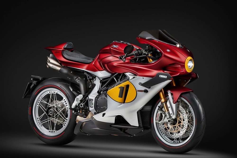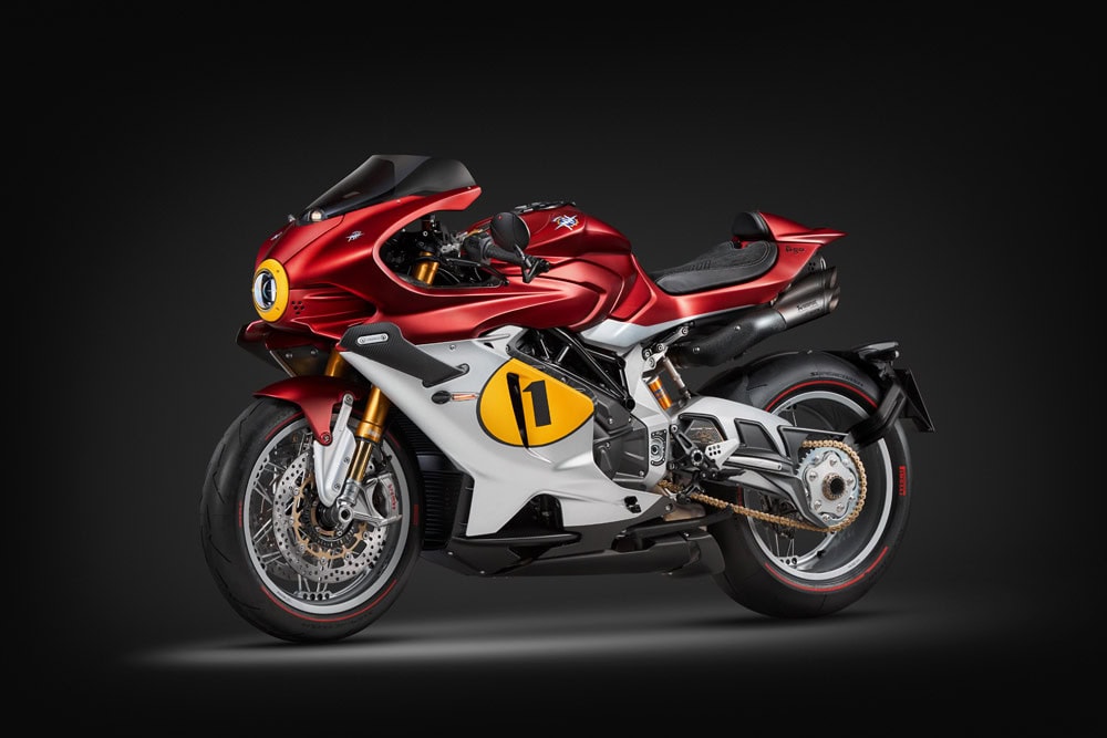 La carrozzeria in carbonio forgiato e intrecciato, colorata con la classica livrea rosso-argento, richiama lo stile delle MV storiche. Il numero “1” su sfondo giallo, simbolo di Agostini, spicca sul cupolino, incorniciato da alette aerodinamiche integrate e sospensioni elettroniche Öhlins a vista. Ogni moto è numerata individualmente, con una placca d’oro fissata sul serbatoio in pelle.