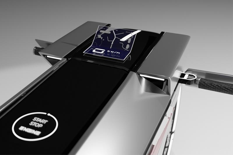 Due i dettagli più interessanti: da una parte le ruote, ampie e completamente vuote al loro interno, con dettagli high-tech sulla superficie dei sottilissimi cerchi. L’altro è invece dato dall’assenza di cruscotto, sostituito da un piccolo head up display semi-trasparente, e dalla carrozzeria soft-touch.