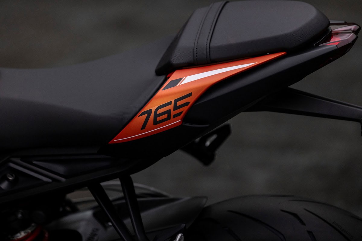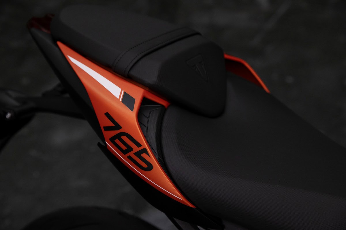 Il serbatoio da 15 litri con pannelli laterali integrati e design angolare si abbina perfettamente ai convogliatori del radiatore dall’aspetto aggressivo. Il codino ha un design sportivo orientato verso l’alto. Il silenziatore aggiunge un tocco di aggressività, enfatizzando il caratteristico sound del motore a tre cilindri.