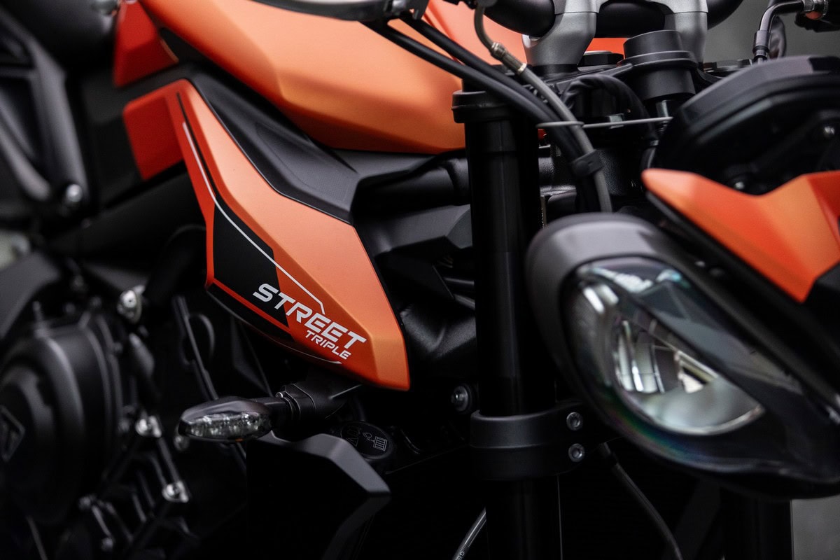 La Street Triple 765 R A2 sarà disponibile in due nuove colorazioni: Matt Baja Orange e Pure White. La versione Matt Baja Orange presenta un serbatoio e pannelli laterali abbinati, mentre la Pure White include dettagli in Baja Orange su copriserbatoio e parafango anteriore, con una rifinitura dei fari in Pure White e pannello laterale del radiatore in Storm Grey.