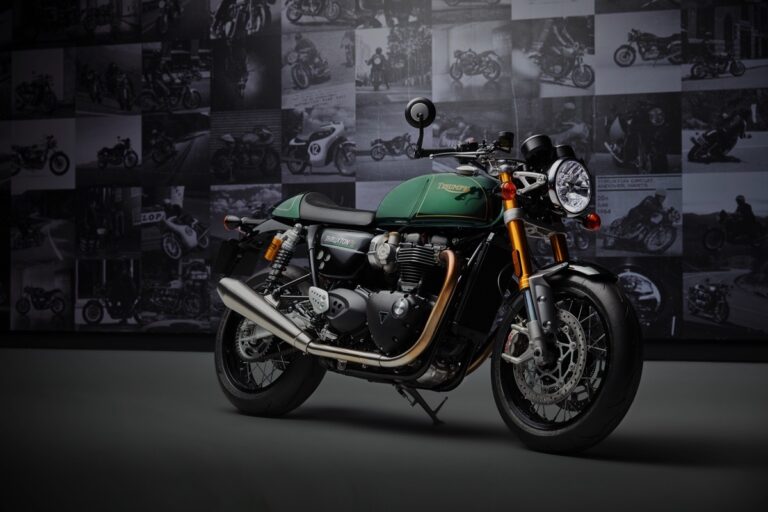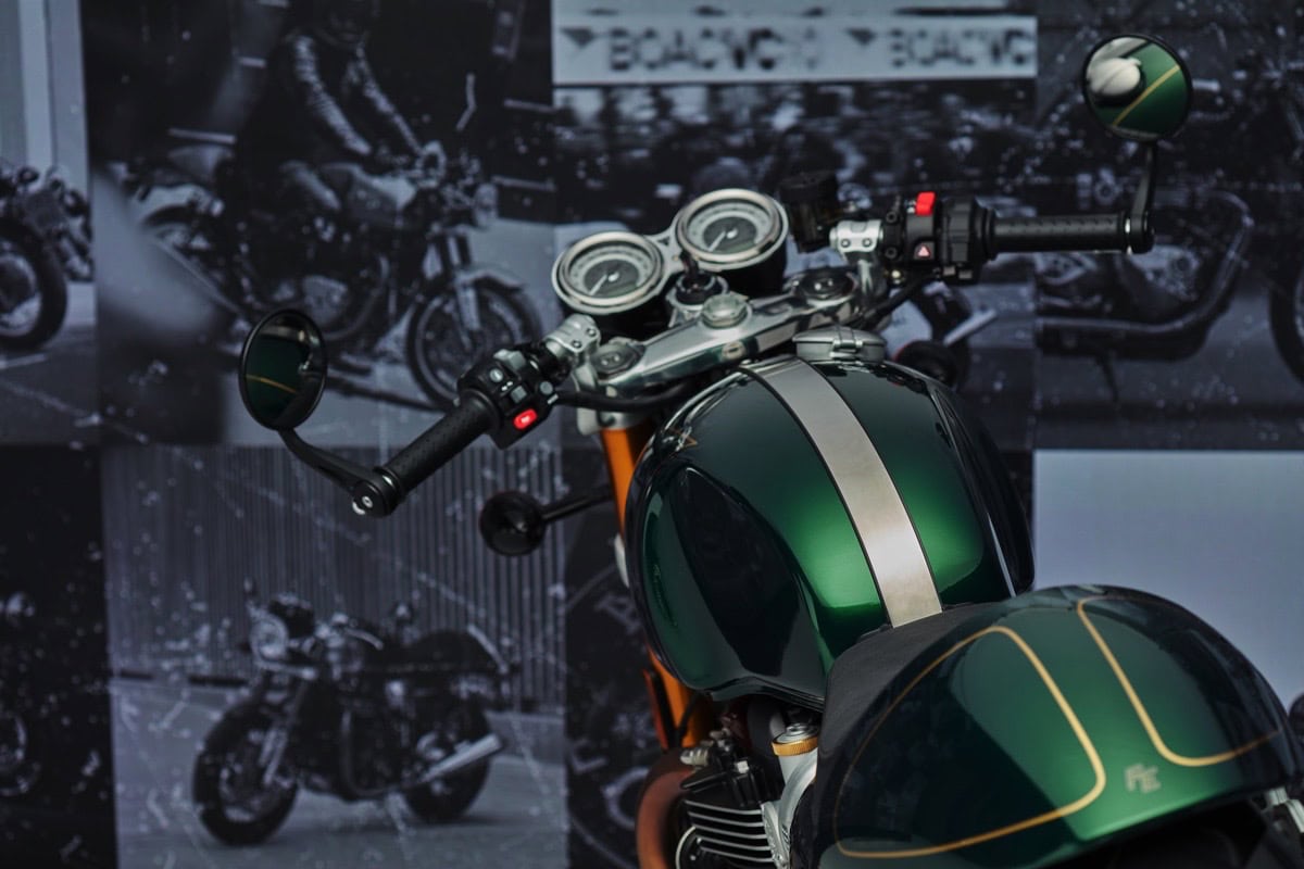 L’estetica della moto mantiene il classico stile “café racer” della Thruxton, con una combinazione di colori e dettagli che omaggiano la tradizione sportiva britannica. La livrea Competition Green, le finiture dorate e gli elementi in nero conferiscono un tocco di eleganza e aggressività alla moto.
