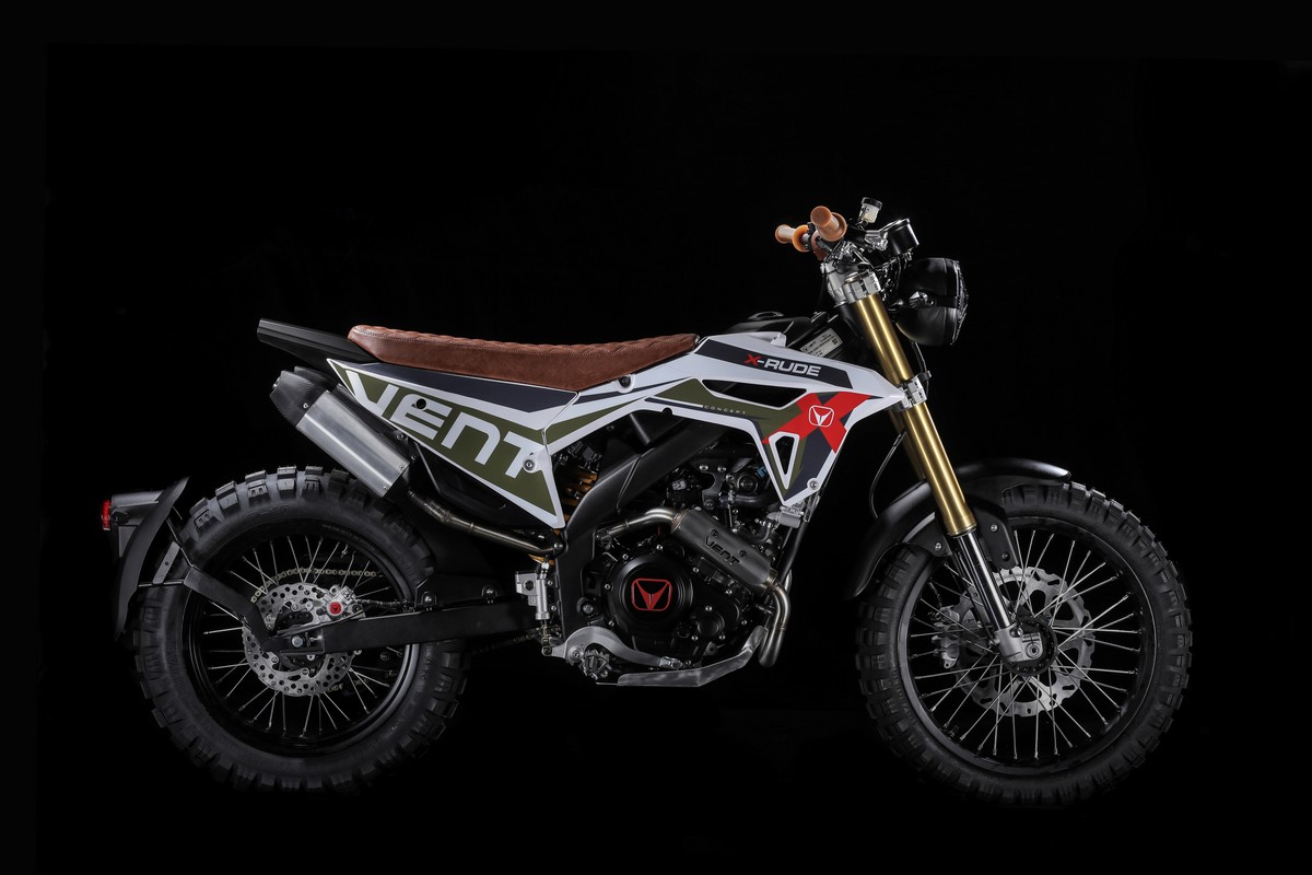Vent, fresca dal lancio dei modelli 125 4 tempi, che per struttura e prestazioni sono moto adatte anche ad un pubblico più adulto, ha pensato di lavorare su un concetto di moto che si staccasse visivamente dalla tradizione e uscisse dagli schemi tradizionali del marchio. Il risultato è un veicolo molto accattivante dal punto di vista estetico e con un equipaggiamento che richiama inequivocabilmente ai trend odierni.