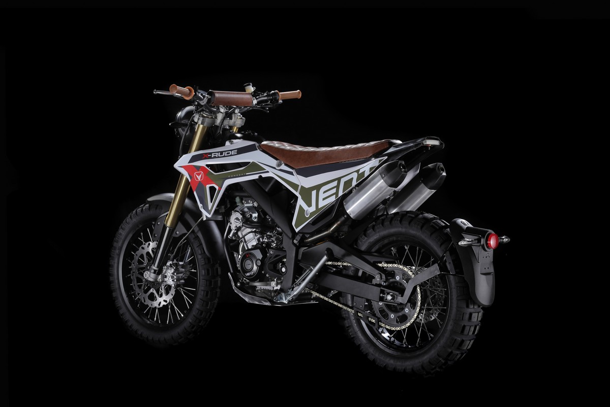 Il nome X-Rude vuole sottolineare il carattere mascolino di questo modello ideato da VENT: è maleducata nel nome (dall’inglese “rude”) e nello stile. Strizza l’occhio a più segmenti, dalle Cafè Racer alle Scrambler. Ha uno stile elegante, con grafiche e dettagli tecnici che la connotano decisamente in una dimensione differente rispetto alle moto oggi disponibili nella gamma Vent. Le dimensioni della moto, benché con un motore 125 cc, sono importanti.