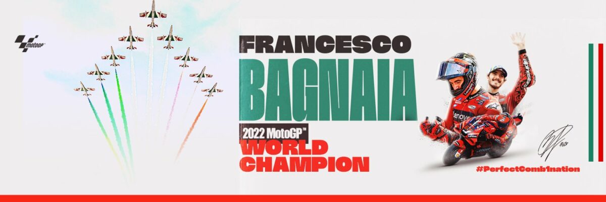 Francesco Bagnaia è campione della MotoGP 2022 a Valencia, primo italiano a vincere il titolo dopo il dominio di Valentino Rossi, e primo italiano a vincere su moto italiana dai tempi di Giacomo Agostini.
