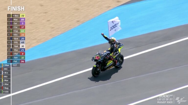 Da quel momento in poi, Bezzecchi ha preso il comando della gara, mantenendo un solido vantaggio di 4″2 sul secondo classificato, Jorge Martin. Quest’ultimo, pilota della Ducati Pramac, ha replicato la sua ottima prestazione nella gara Sprint Race e ha conquistato il secondo posto, mentre Johann Zarco, compagno di squadra di Martin, ha completato il podio.
