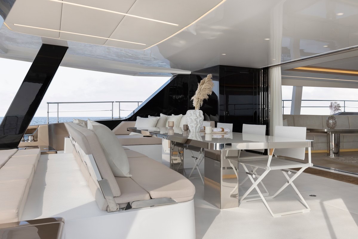 Il pozzetto di poppa di Sol ha anche un’ampia zona pranzo con una spettacolare vista sull’oceano. Ben protetto dai raggi del sole e dal vento, è dotato anche di un ampia lounge. Dal pozzetto gli ospiti possono accedere facilmente alla zona di poppa dello yacht, dove si trovano le moto d’acqua. Sul flybridge, gli ospiti di Sól godono di un ampio spazio per il relax, con una grande sala da pranzo a forma di C, un bar e prendisole di grandi dimensioni.