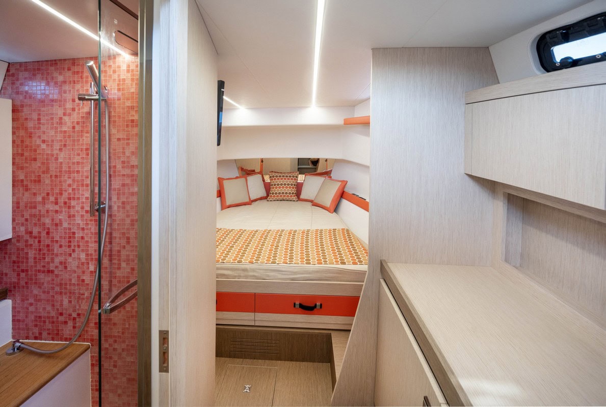 Il ponte sottocoperta presenta una spaziosa cabina con un grande letto matrimoniale situato nella parte anteriore, armadi e mobili con inserti rivestiti in pelle, oltre a un bagno dotato di una generosa cabina doccia separata. L’arredamento degli interni di questo Speedster riprende il vivace e caldo color corallo in parte di tessuti e dettagli, offrendo nell’insieme l’atmosfera luminosa degli ambienti mediterranei, ma il cantiere offre agli armatori la possibilità di personalizzare i colori delle pelli, dei tessuti, delle stoffe e delle essenze di legno a seconda dei suoi gusti.