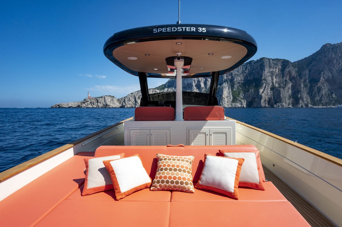 Apreamare Gozzo 35 Speedster, come la sua sorella entrobordo rientra nella categoria dei natanti con una lunghezza di 9,95 metri, ma è dotato di generosi spazi in coperta. A poppa troviamo un comodo divano prendisole e un tavolo, ideale per organizzare piacevoli cene all’aperto. I camminamenti sono ampi e sicuri grazie alla larghezza massima di 3,70 metri dell’imbarcazione e nella zona di prua si trova un ampio prendisole abbinato a un comodo sistema di sedute contrapposte. Il riparo dal sole è garantito da un T-Top alla cui base è allestito un mobile cucina che potrà essere attrezzato con lavello, piano cottura o barbecue, frigorifero e ice-maker.