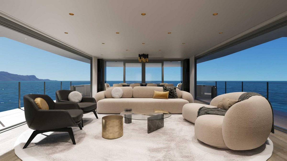 In più, la ricerca del contatto con la natura è molto profonda: gli ambienti sono in continuo dialogo tra indoor e outdoor grazie alle enormi porte-finestre trasparenti e apribili che permettono alla natura di entrare letteralmente nello yacht e diventarne gradita ospite. Gli spazi, inondati dalla luce naturale e avvolti dai suoni e profumi del mare, diventano tutt’uno col panorama circostante.