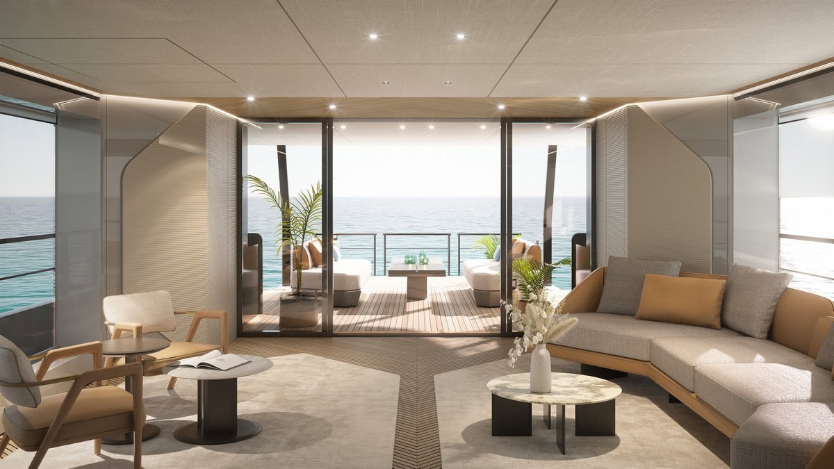 La luce riveste un ruolo da protagonista negli spazi a bordo di Grande 30M: dalle ampie vetrate a tutta altezza alla scala interna, resa etereamente leggera per conferire a questo elemento strutturale un carattere artistico e regalare una cascata di luce che discende dall’Upper Deck fino al ponte principale. Questa concezione architettonica si sposa con una meticolosa attenzione al dettaglio e alla capacità di armonizzare materiali diversi, nell’incessante ricerca di un minimalismo sostenibile che tiene a cuore il benessere delle persone e il rispetto per l’ambiente.