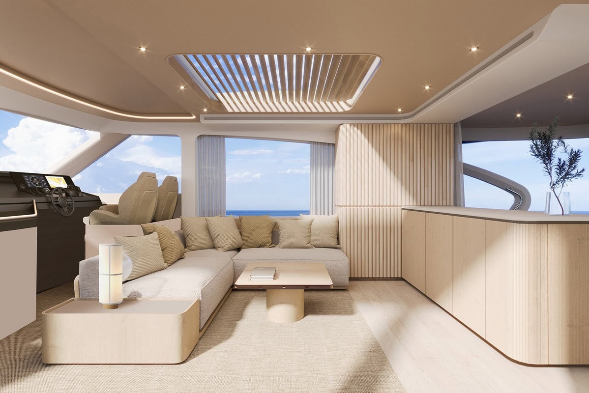 È la «Fun Island», un ambiente di bordo reimmaginato per offrire un’esperienza immersiva nella natura, ma anche un nuovo modo di stare insieme in barca. Perché quando le grandi vetrate sono aperte interni ed esterni diventano un unico ambiente e la possibilità di interagire fra tutti, anche con chi è in acqua, abbatte l’ultima barriera fisica e di socialità. È lo spazio, reale e simbolico, del «fun».