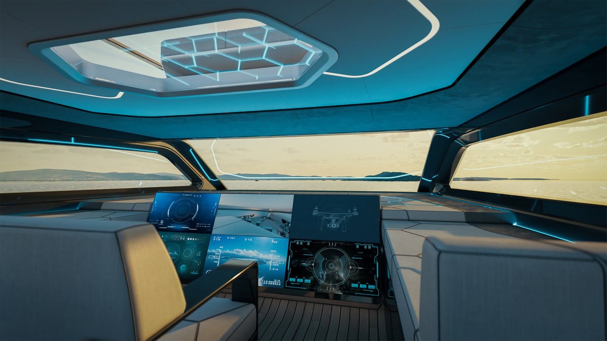 L’innovazione tecnologica abbraccia l’esperienza a bordo attraverso sei grandi monitor indipendenti, situati difronte all’area lounge, che offrono agli ospiti la possibilità di vivere esperienze singole o condivise, dalla visione di film alla musica, passando per itinerari cartografici e persino la prospettiva aerea fornita da un drone. Questo approccio all’intrattenimento a bordo trae ispirazione dal mondo ferroviario, in particolare dal celebre treno “Settebello”, rivisitando l’idea di osservazione e comando in una chiave marittima moderna.