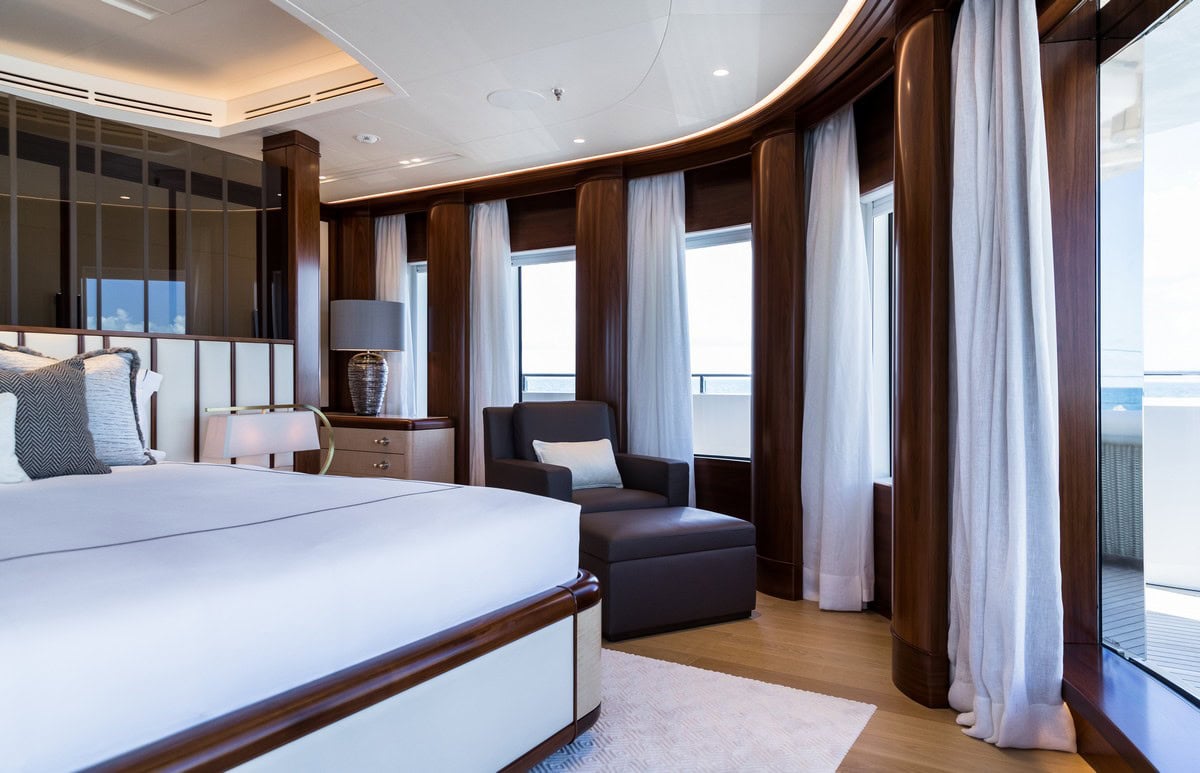 Le quattro cabine doppie per gli ospiti, di cui due matrimoniali e due a letti singoli (convertibili), sono a centro nave sul Lower Deck e completamente separate dagli alloggi di prua dei 16 membri di equipaggio voluti dall’armatore con materiali ed elementi di arredo simili a quelli usati per la zona ospiti. Percorsi separati e dumb waiter assicurano la massima privacy e un servizio eccellente a bordo collegando questi ambienti con la galley del Main Deck e i ponti superiori.