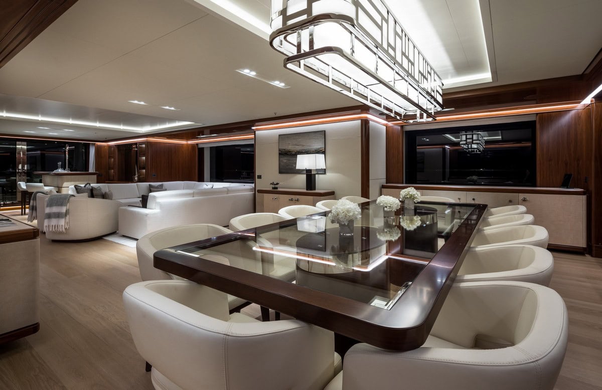 La poppa del Main Deck accoglie gli ospiti in un’ampia zona lounge per i momenti all’aria aperta. All’interno, il salone principale con un tavolo per 12 persone, divani e poltrone precede la galley. L’armatore ha poi voluto su questo ponte due ampie cabine Vip, ciascuna su un lato dello yacht, mentre a prua due garage di diverse dimensioni ospitano il tender principale e i vari water toys.
