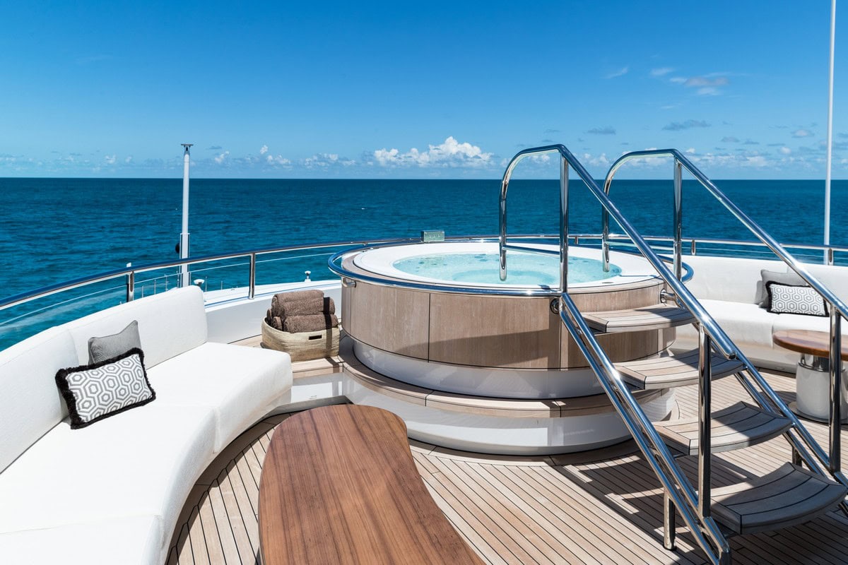Si tratta di uno spazio aperto ma molto privato che, grazie a un accurato studio dei volumi e delle profondità, nella sua prima parte, non è visibile dai ponti superiori. L’estrema prua infine può diventare una piattaforma touch and go per l’elicottero dando all’armatore la massima libertà per salire a bordo. Sempre sullo stesso ponte, a poppa, una zona all’aperto con tavolo da pranzo, area relax con poltrone e sedute si completa con un salotto interno con mobile tv.