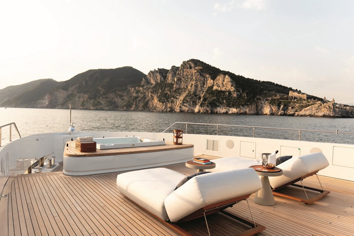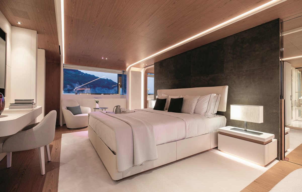 Il layout comprende una suite armatoriale a prua del ponte principale e quattro suite per gli ospiti sul Lower Deck, tutte con letto matrimoniale. Una scala a spirale collega i ponti fino alla skylounge sull’Upper Deck. Loro Piana Interiors ha vestito gli interni con tessuti estivi come il lino bianco, blu e malachite.