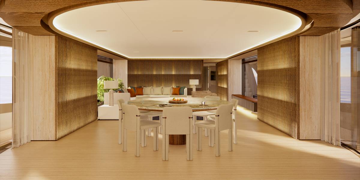 Gli interni del nuovo Oasis 42M sono stati affidati allo studio Bonetti/Kozerski Architecture, che ha interpretato la filosofia Oasis con un approccio orientato al benessere e alla fluidità degli spazi.
