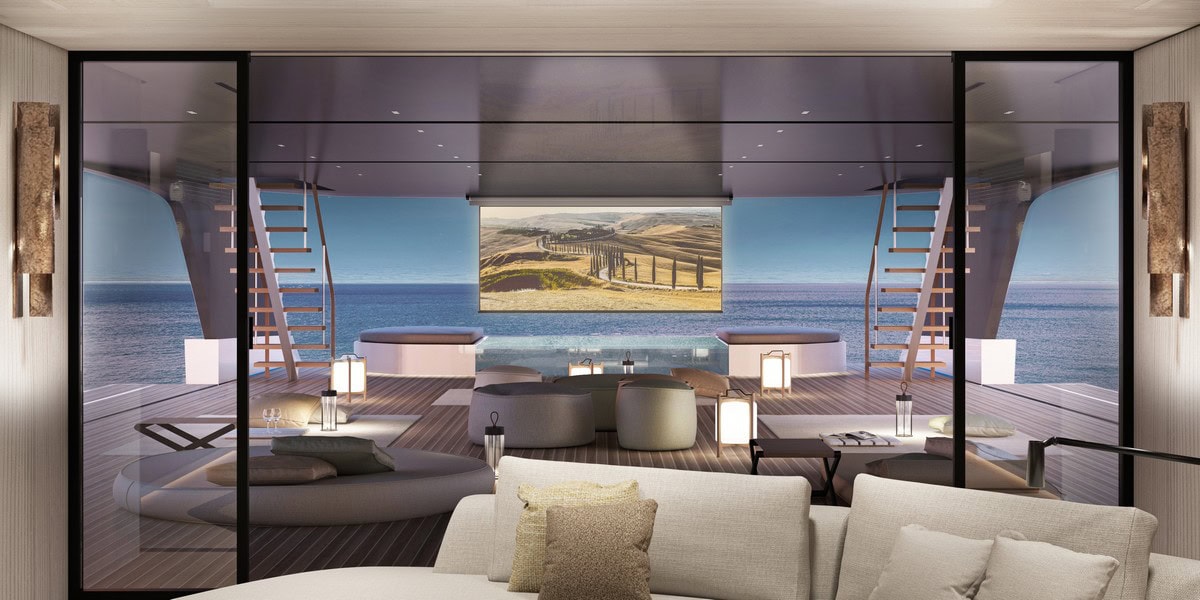 L’interior design, progettato da Parisotto + Formenton, utilizza materiali come teak decapato, carbonio, bronzo, vetro e ottone. Le tonalità e gli arredi richiamano l’atmosfera marina, con linee nette e ampie finestrature per un continuo dialogo con luce e panorama.