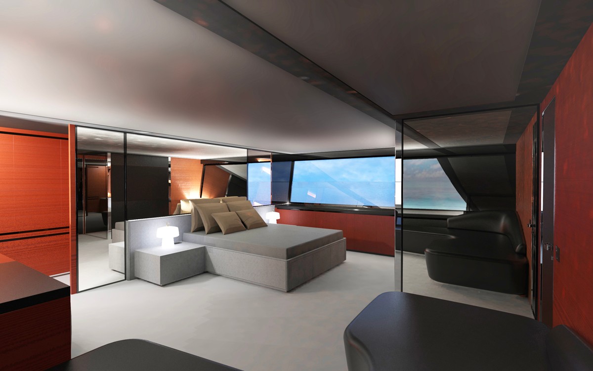 Sotto l’hardtop chiuso si trova un accogliente salone con la zona pranzo e la plancia di comando, mentre le porte in vetro scorrevoli assicurano l’accesso al ponte di poppa. Per gli ospiti sottocoperta sono previste quattro cabine: una suite armatoriale a tutto baglio a centro barca, una suite VIP a prua e due cabine singole doppie. Le due cabine dell’equipaggio hanno invece l’accesso indipendente a prua. Il layout e l’arredo degli interni possono essere personalizzati in base alle preferenze del futuro armatore.