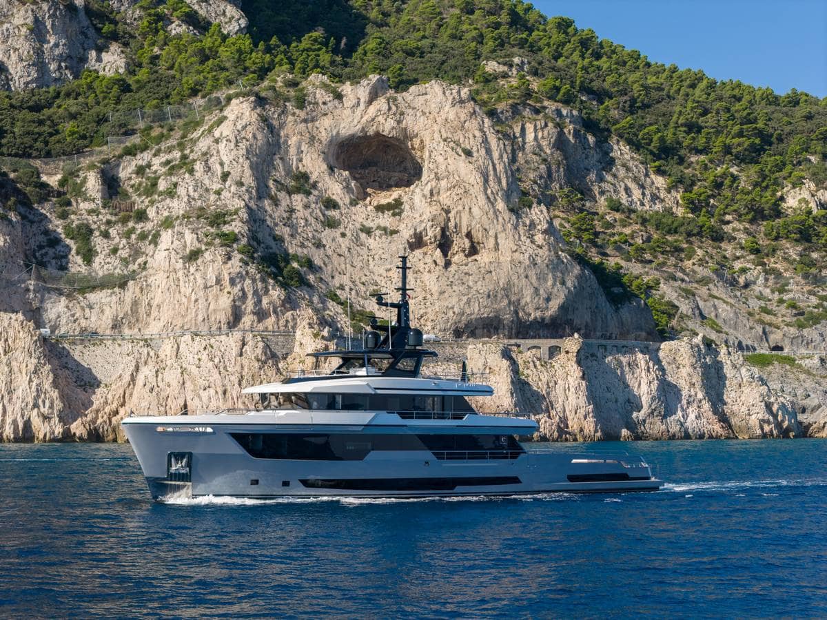 Disegnato da Hydro Tec per le linee esterne e con interni firmati Hot Lab, Big Naan è un 42 metri compatto ma sorprendentemente versatile, con una stazza lorda di 443 GT. Le sue forme muscolari e scolpite, spinte verso prua, raccontano un’anima da explorer, mentre lo scafo in acciaio e le sovrastrutture in alluminio incarnano la perfetta fusione tra solidità e leggerezza.