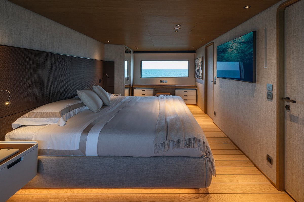 La suite armatoriale di 40 mq è progettata per offrire il massimo comfort e privacy, con ampie vetrate che garantiscono una vista continua sul mare. I bagni, rifiniti in Pietra d’Orcia, presentano docce che fungono anche da bagni turchi, confermando l’attenzione ai dettagli e al benessere degli ospiti.