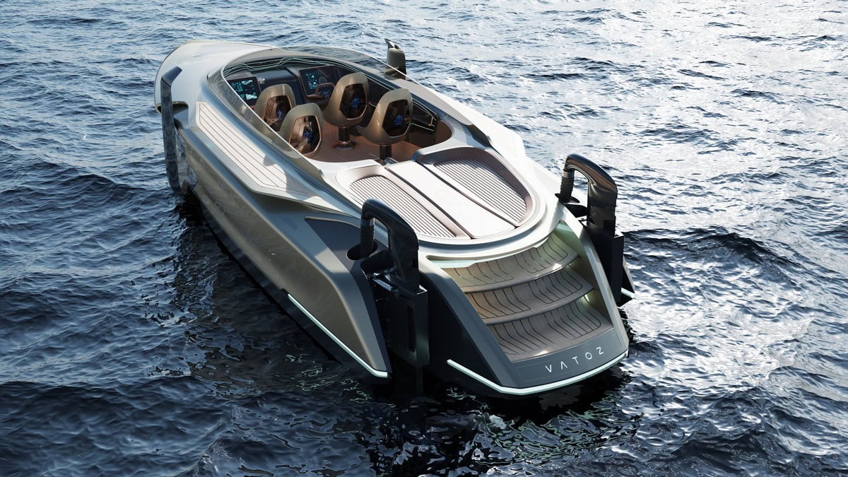 I parafanghi laterali sono stati progettati per consentire un facile accesso alla zona anteriore, impedendo al tempo stesso alle onde di raggiungere la cabina. I vetri oscurati trasformano lo yacht in un puro capolavoro scultoreo. Vatoz ha lo scafo in fibra di carbonio ed utilizza anche l’efficiente tecnologia Foiler di Enata, che consente all’imbarcazione di volare a 1,5 metri sull’acqua, insieme al sofisticato sistema di gestione Wingman.