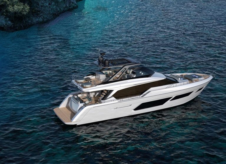Nato dalla collaborazione tra Officina Italiana Design, lo studio fondato dal designer Mauro Micheli insieme a Sergio Beretta, Comitato Strategico di Prodotto Ferretti Group presieduto dall’Ing. Piero Ferrari, e Dipartimento Engineering, il nuovo flybridge, lungo 28, 49 metri e largo 6,50 metri, possiede elementi caratterizzanti nel design degli esterni, come la grande finestratura a scafo, le lunghe vetrate a tutt’altezza in coperta e le potenze laterali con superfici in cristallo a poppa, che esaltano ulteriormente l’aerodinamicità del profilo.