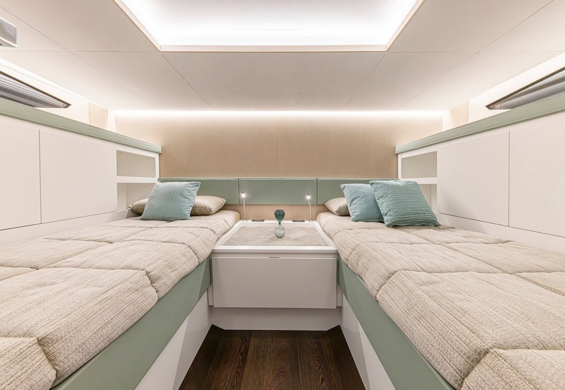 Tra le caratteristiche peculiari, spiccano il garage per il tender e la spiaggia di poppa transformer, ideale sia come passerella che come piattaforma per i bagni in mare. All’esterno, un parabrezza a tutto baglio con una grande porta centrale conduce dalla zona prodiera all’area centrale in completa sicurezza, rendendo tutti gli spazi interconnessi ma al contempo separabili, con un’area living e dinner ampia e confortevole, inno alla convivialità.