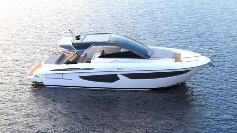 L’imbarcazione sarà disponibile in due versioni: una versione open, con la vetrata frontale più bassa, e una versione con Hard Top integrato e vetro chiuso. L’Hard Top, in perfetta armonia con le linee morbide dello scafo, è stato studiato con riferimenti all’automotive, per conferire un senso di dinamismo e leggerezza, valorizzato con particolari in acciaio e inserti laterali in vetro retroilluminato.
