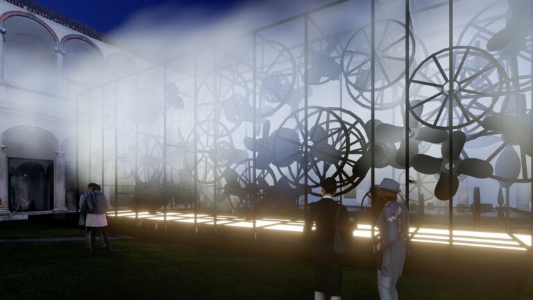 La macchina impossibile è una imponente scultura metallica: una macchina complessa, altamente tecnologica ma definita nei dettagli da un sapiente lavoro manuale proprio come uno yacht. Posizionata al centro del Cortile del ‘700, l’intera struttura poggia su di una piattaforma retroilluminata che esalta un meccanismo realizzato con eliche e ruote dentellate.