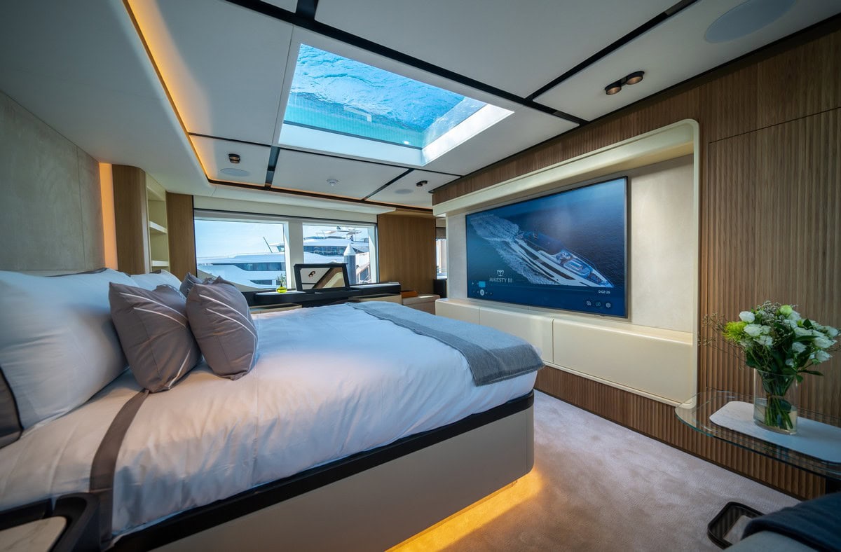 Il Majesty 111 è caratterizzato da una disposizione a 6 cabine – 5 cabine ospiti sul ponte inferiore e una cabina VIP di 15 mq a prua, simile a una cattedrale, che ridefinisce la pianificazione degli spazi. L’ottimizzazione della vivibilità e il collegamento senza soluzione di continuità tra interno ed esterno sono ottenuti grazie alle ampie e alte superfici vetrate, quasi il 40% in più rispetto a uno yacht di lunghezza inferiore ai 100 piedi, per un’atmosfera luminosa e ariosa negli interni e una vista esterna illimitata nelle varie zone sociali posizionate sui vari ponti.