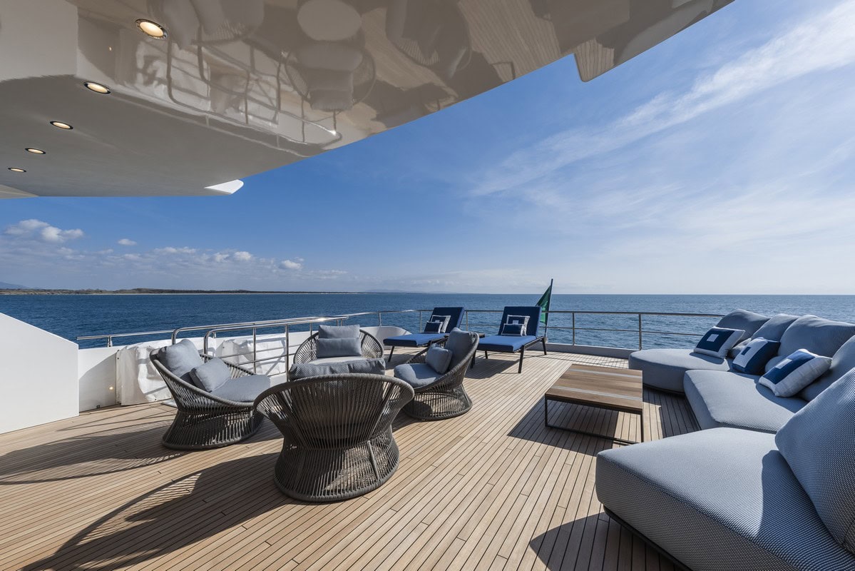 Lo Sky Lounge è caratterizzato da vetrate laterali completamente abbattibili e da una porta di poppa a scomparsa, in modo tale da poter comodamente trasformare uno spazio chiuso e riservato in uno aperto ed arioso in diretta comunicazione con l’area esterna. Il salone nello Sky Lounge, di circa 50 metri quadrati, è impreziosito da arredi selezionati tra i più prestigiosi brand di arredamento italiano e completato da meravigliose opere d’arte.