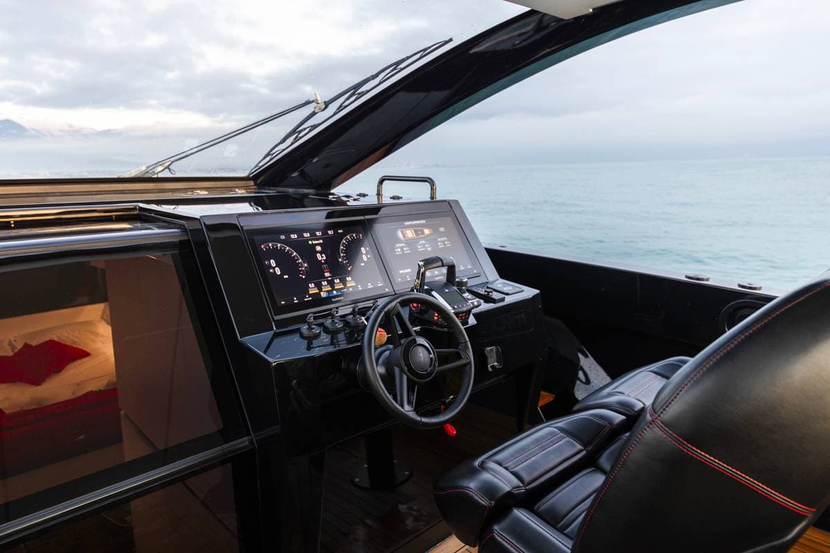Gli interni, firmati da Simeone, combinano materiali di pregio come teak, rovere e finiture laccate. È inoltre possibile scegliere rivestimenti esclusivi in collaborazione con marchi come Loro Piana e Maria Flora. La plancia di comando integra sedute ergonomiche Besenzoni e due display Garmin da 19 pollici, per un controllo completo dell’imbarcazione, dall’autopilota all’illuminazione.
