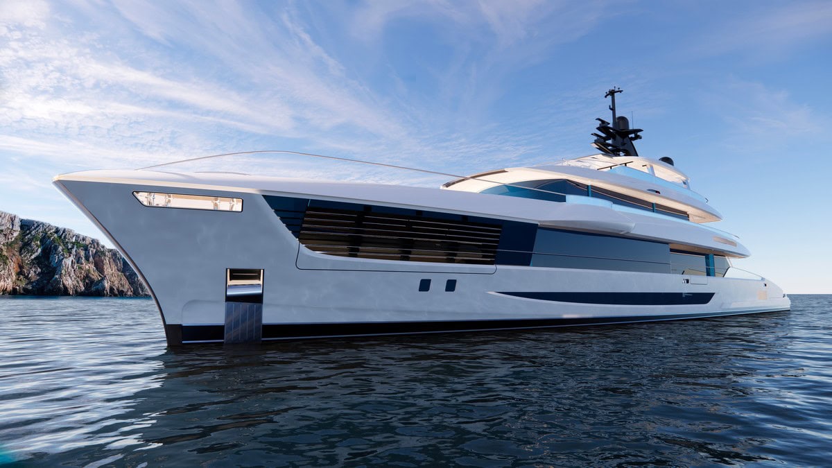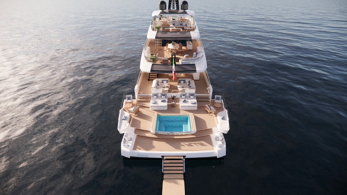 All’interno dello yacht, l’attenzione ai dettagli si manifesta in ogni angolo. Le cabine VIP e la suite armatoriale sono esempi di lusso e comfort, con ampie terrazze scorrevoli che offrono privacy e viste mozzafiato. La possibilità di personalizzazione degli interni consente agli armatori di imprimere un tocco personale unico, rendendo ogni yacht un’opera d’arte su misura. L’area di poppa rappresenta un’esperienza unica: un ampio beach club e una terrazza sul mare con piscina integrata customizzabile e piattaforme abbattibili che estendono l’area sull’acqua.