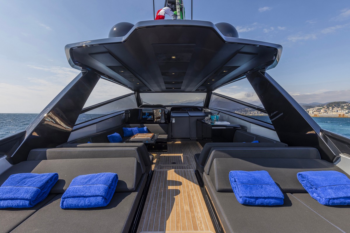 Il pozzetto coperto è dotato di mobile bar, divano ad angolo e una comoda zona pranzo oltre a due prendisole ad estrema poppa con passaggio centrale. Anche la piattaforma bagno e le griglie di scarico posizionate nello specchio di poppa sono state ridisegnate: quest’ultima ora è integrata e nascosta nel nome della barca.