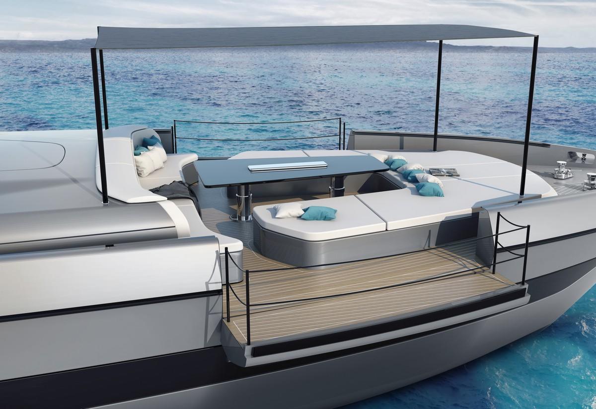 Tutte le aree all’aperto possono essere ombreggiate da bimini su supporti in fibra di carbonio. Un interessante elemento di design è il divano che dal portellone di poppa si allunga sulla grande plancetta a creare una comoda seduta che si affaccia sul mare. Il layout interno a quattro cabine prevede, sul ponte principale, un arioso salone a pianta aperta e una zona pranzo a poppavia della timoneria: le ampie vetrate sono progettate per fornire viste panoramiche sul mare anche da seduti.