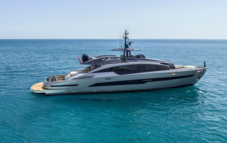 Lo yacht, in questa nuova gamma, si tinge di una nuova tonalità di grigio con la tuga caratterizzata da un blue speciale e le ampie vetrate inondano di luce naturale gli ambienti interni. Un garage, che stiva un tender di oltre 5 metri, una moto d’acqua e altri water toys, un esclusivo beach club a pelo d’acqua di 39 metri quadrati rivestito di teak e protetto a poppa da un coronamento apribile con movimentazione elettroidraulica che mette in comunicazione la spiaggetta e la zona beach antistante creando uno spazio di dimensioni notevoli.
