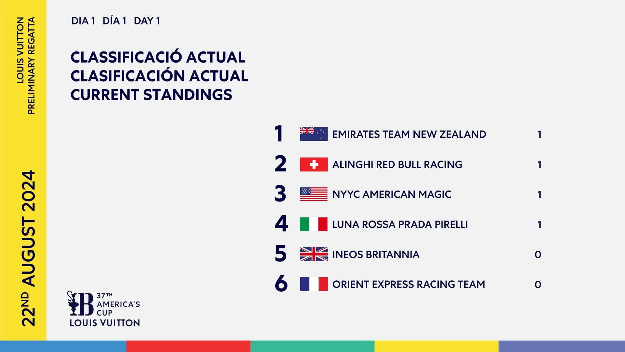 Alinghi Red Bull Racing ha preso il comando fin dall’inizio, grazie a una partenza perfetta e a un’eccellente comunicazione a bordo. Nonostante un inizio incerto da parte di Orient Express Racing Team, penalizzato da un’infrazione prima della partenza, i francesi hanno cercato di recuperare terreno. Tuttavia, la squadra svizzera ha mantenuto il vantaggio per tutta la regata, gestendo con maestria ogni fase, fino a concludere con un distacco netto di 36 secondi.