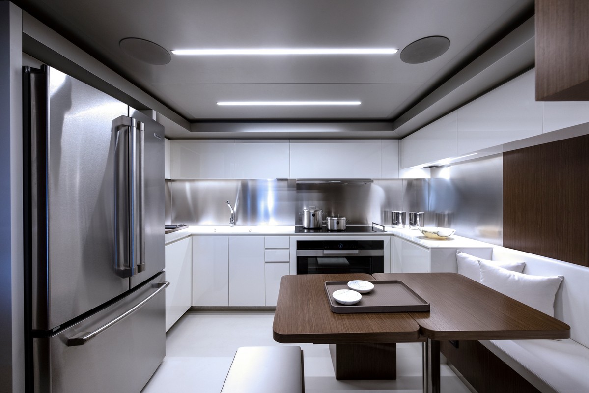 Proseguendo verso prua, a dritta si trova l’ampia e spaziosa cucina di 11 mq con layout a ferro di cavallo progettato per sfruttare al massimo lo spazio a disposizione. Il piano di lavoro è in Corian bianco mentre le ante sono in laccato bianco lucido; gli elettrodomestici, compreso il frigorifero americano, così come il rivestimento della parete sono in acciaio inox satinato. Speculare alla porta di ingresso, si trova il tavolo da pranzo dell’equipaggio allungabile in legno, al fianco del quale vi è la porta di accesso al lower deck e all’area a disposizione dell’equipaggio.