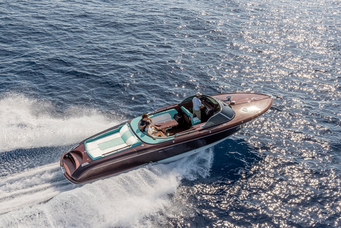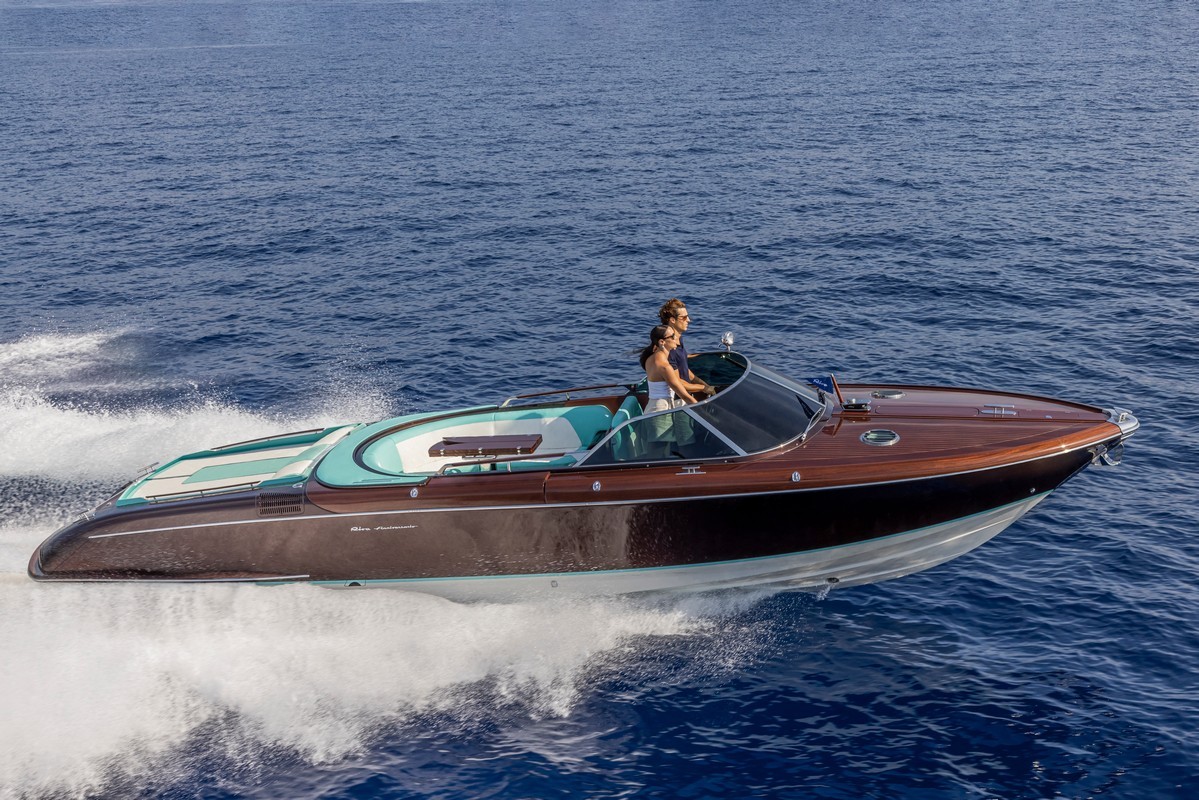 Dettagli inequivocabili, in perfetto stile Riva, permeano l’area di prua. Spostandosi verso la postazione di comando, la plancia include due display digitali da 12’’ e strumentazione di navigazione integrata. Non mancano i richiami vintage ispirati all’Aquarama, come una tasca porta oggetti in paglia di Vienna con profili in acciaio dietro il sedile pilota.