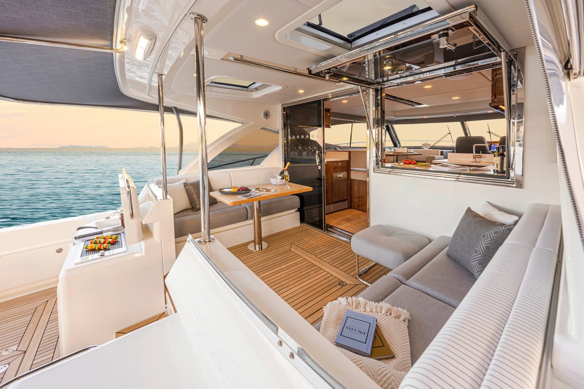 Il Riviera SUV 505 vanta un ampio e flessibile pozzetto che consente di pescare, fare immersioni, andare in paddle-board o semplicemente intrattenersi con la famiglia e gli amici, mentre il ponte all’aperto semi-chiuso a prua è il centro sociale del 505. Dal ponte all’aperto si accede al lussuoso salone con cucina a poppa a sinistra e area lounge di fronte a prua, mentre il timone si trova a dritta con un’ulteriore area lounge pranzo di fronte.