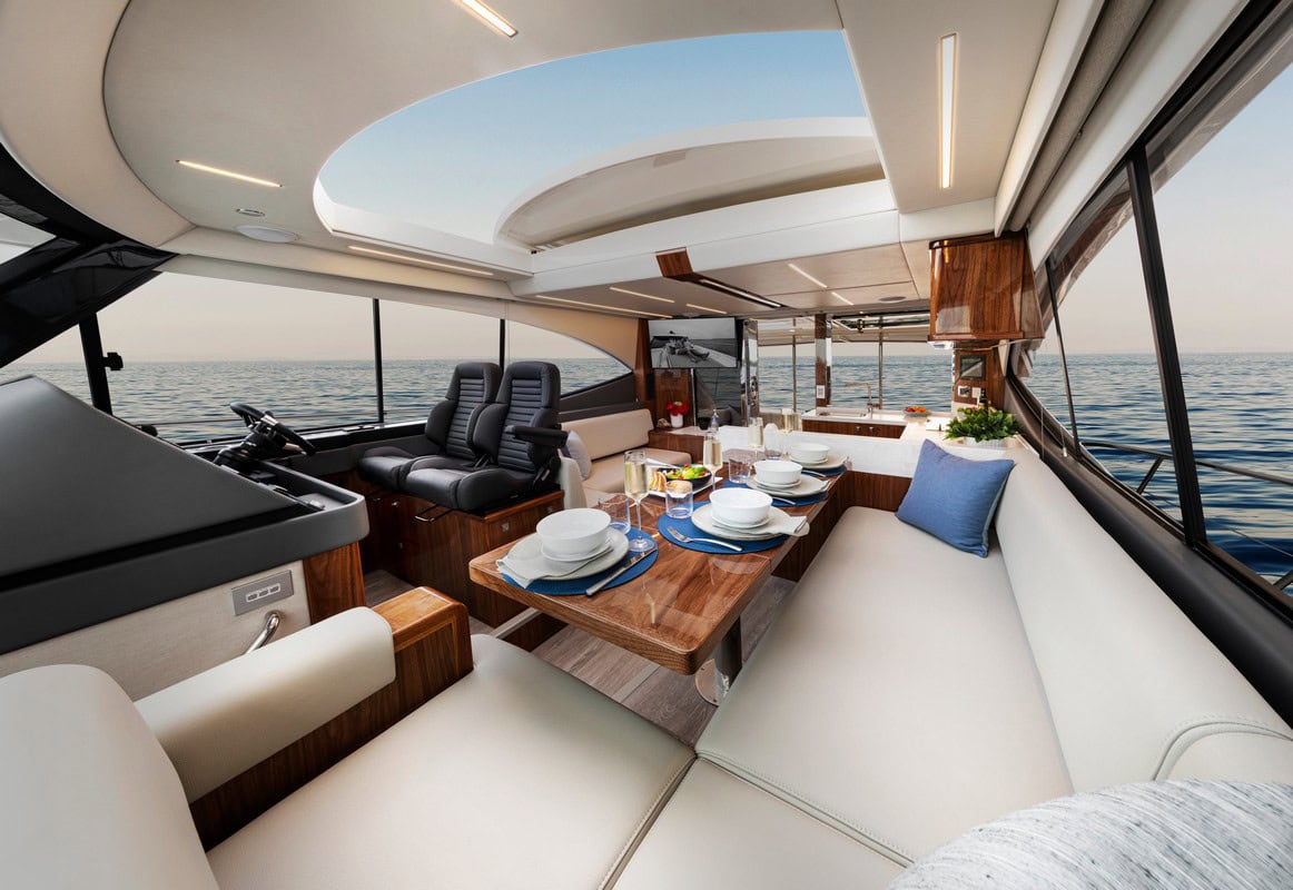 Una cucina gourmet a U si trova a poppa sul lato di dritta del salone. A prua, sul lato sinistro, un grande tavolo da pranzo pieghevole in legno è circondato da un lussuoso salotto a C che può ospitare fino a sei persone. Il timone si trova immediatamente a prua della cucina. Il 465 SUV offre tre generose cabine e due bagni sul ponte degli alloggi. L’alimentazione del SUV 465 è affidata a due Volvo Penta D8-IPS800 da 441 kW (600 CV) ciascuno.